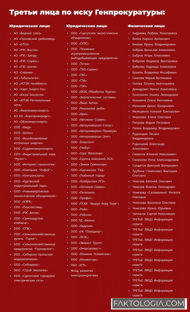 Среди них — ООО «Сибирско-Уральская Медиакомпания», владеющая информационным порталом URA.RU, которая оказалась в списке третьих лиц, несмотря на то, что формально принадлежит двум физическим лицам — Елене Куимовой (75%) и Михаилу Вьюгину (25%). Беспрецедентный масштаб дела Судебный процесс выделяется не только объемом изымаемого имущества, но и количеством участников: в нем фигурируют 153 лица. Из них 37 являются ответчиками, включая 21 юридическое лицо (2 акционерных общества и 19 обществ с ограниченной ответственностью) и 16 физических лиц. Однако основной интерес вызывает группа третьих лиц, которая насчитывает 116 участников.Подавляющее большинство третьих лиц — 77 компаний — представлено структурами энергетического и жилищно-коммунального комплексов, а также предприятиями строительного, агропромышленного и транспортного секторов. Среди них значатся такие организации, как АО «РЭС-Восток», АО «ЮТЭК-Региональные сети», АО «Облкоммунэнерго» и ООО «Сургутские городские электрические сети». Также в этой категории заявлены 30 физических лиц.