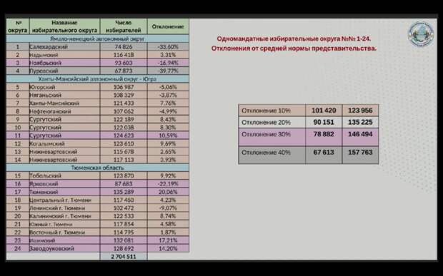 Средняя норма представительства в новой нарезке выросла со 106 до 112 тысяч избирателей на один мандат. При формировании округов избирательная комиссия применяла допустимые законом отклонения от этой нормы. Стандартное отклонение в 10% было дополнено использованием норм в 20% для округов, объединяющих несколько муниципалитетов, и в 30-40% для территорий с труднодоступными и отдалёнными местностями. «В Ханты-Мансийском автономном округе все укладываются в отклонение 10%, за исключением Сургутского округа, там немножко превышение, но опять же мы понимаем, что в состав Сургутского 11-го округа входит ещё Сургутский район, в котором есть труднодоступные отдалённые местности. Там отклонение может быть до 30%», — пояснил Андрей Николаев. На Ямале для Салехардского и Пуровского округов активно применялось отклонение в 30-40%, допустимое для территорий с местами компактного проживания коренных малочисленных народов Севера.