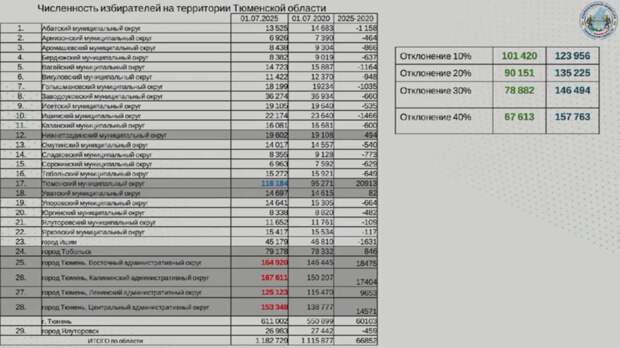 «Что касается юга Тюменской области, абсолютно все районы, кроме Нижнетавдинского, Тюменского и Уватского районов, у нас упали в численности избирателей», — констатировал замглавы избиркома. На этом фоне стремительный рост показали Тюмень, прибавившая более 60 тысяч избирателей, и Тюменский район, где число избирателей увеличилось на 21 тысячу. Незначительный прирост отмечен также в Тобольске (на 846 избирателей) и Уватском районе (82 избирателя).