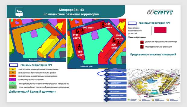 Параллельно дума утвердила повышение этажности в конкретных проектах, таких как «Пойма-4», несмотря на требования жителей соседнего ЖК отказаться от этого решения и их угрозы судебными разбирательствами. Отказ от пакетного решения по КРТ Отказ от включения в генплан единой зоны КРТ стал ключевым изменением в пакете поправок. Изначально эта зона, подразумевающая особый регламент, должна была охватить историческое ядро города и несколько микрорайонов (27А, 43, 34Б), позволяя застройщикам возводить жилые дома высотой до 85 метров (25–30 этажей). Однако на публичных слушаниях 15 декабря жители выразили категорическое несогласие, указывая на риски перегрузки социальной и транспортной инфраструктуры, а также на то, что внесение зоны КРТ в генплан в предложенном варианте влечёт за собой исключение из него целого ряда объектов соцкультбыта, ранее там запланированных.Критика была не только эмоциональной, но и предметной. Один из участников, общественник и предприниматель Владимир Самборский, указал на масштаб планируемой застройки в 43-м микрорайоне: «Я тут посмотрел — одной и той же организации дают 50 земельных участков. Это как?» — отметил он. Действительно, согласно документам, застройщику на этой территории предстоит возвести 50 многоквартирных домов.